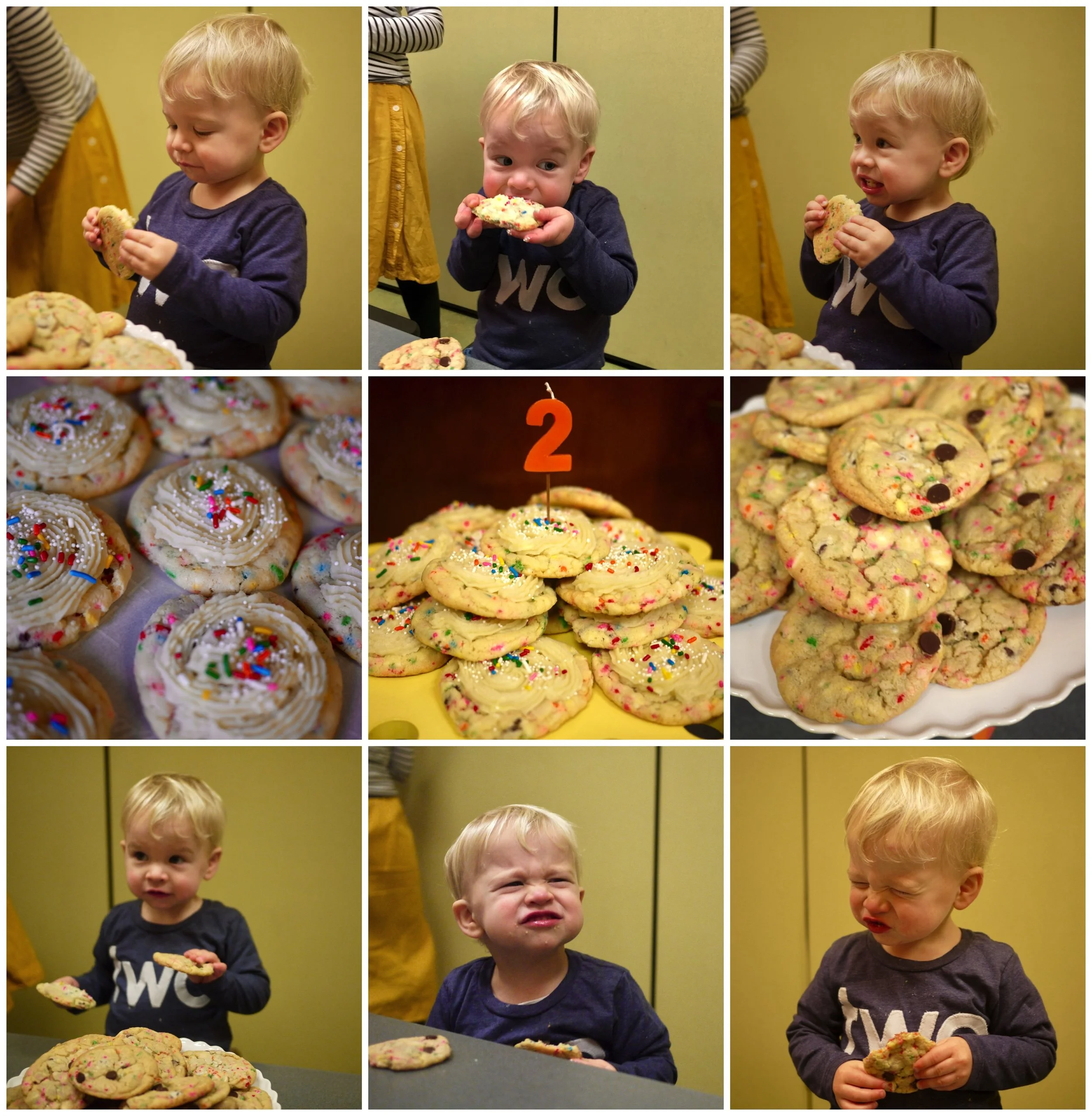 Yup, cookies not cake. This kid loves cookies. It's probably the number one word used these days. He will randomly say it, too. Not to mention he thinks many things are cookies - crackers, circles, etc. He takes his fingers and pretends to eat and says, "cookie cookie cookie." It's too freaking cute. So I put frosting on a cookie and used that for the candle. I made Cake Batter Chocolate Chip cookies and Funfetti Cookies Supreme. He grabbed both cookies - two hands, two cookies, two years.