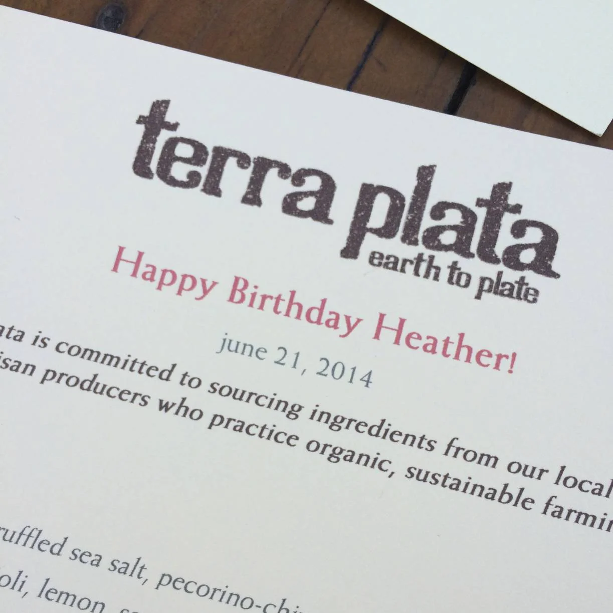 Then, as happy as a clam (remember those two drinks), we headed to dinner at Terra Plata. We sat out on the rooftop patio, which was oh-so-nice. I felt special since they printed "Happy Birthday Heather" on our menus.